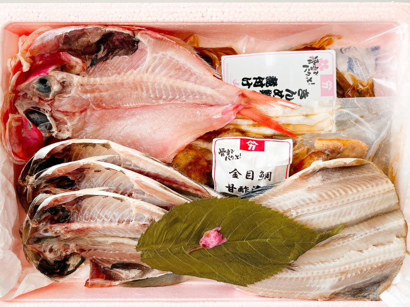 「金目鯛のカブト煮」をプラス。(真あじ3枚、金目鯛1枚、ほっけ1枚、かます2枚、金目鯛カブト煮1袋)