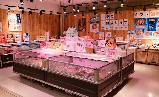 オープンな店内は活気ある市場の雰囲気。施設内には、BBQ場があるので、BBQにピッタリの干物コーナーもご用意しております。