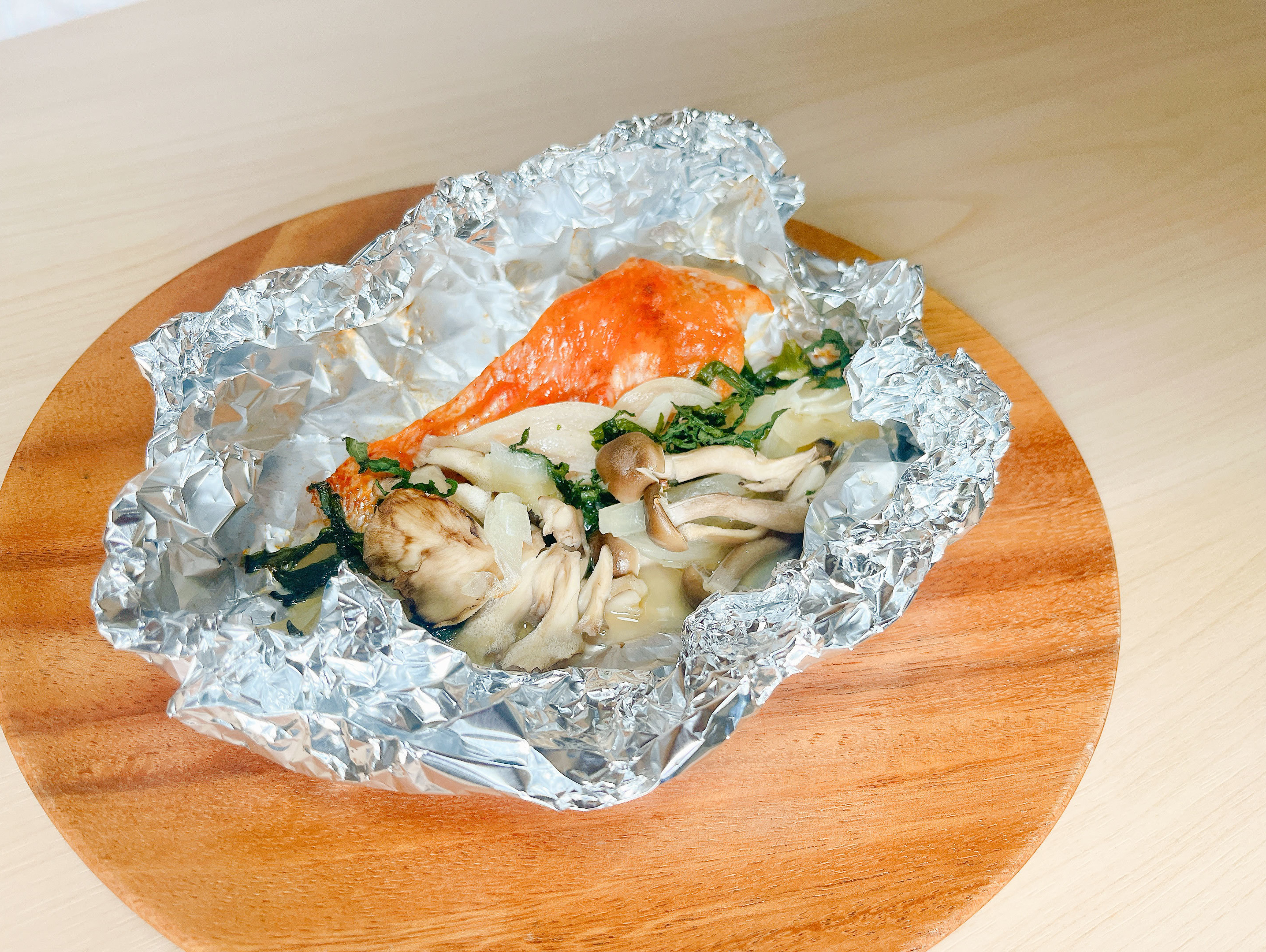③あじ干物を魚焼きグリルで焼きます。一緒にアルミホイルをお皿状にし、みそをのせ